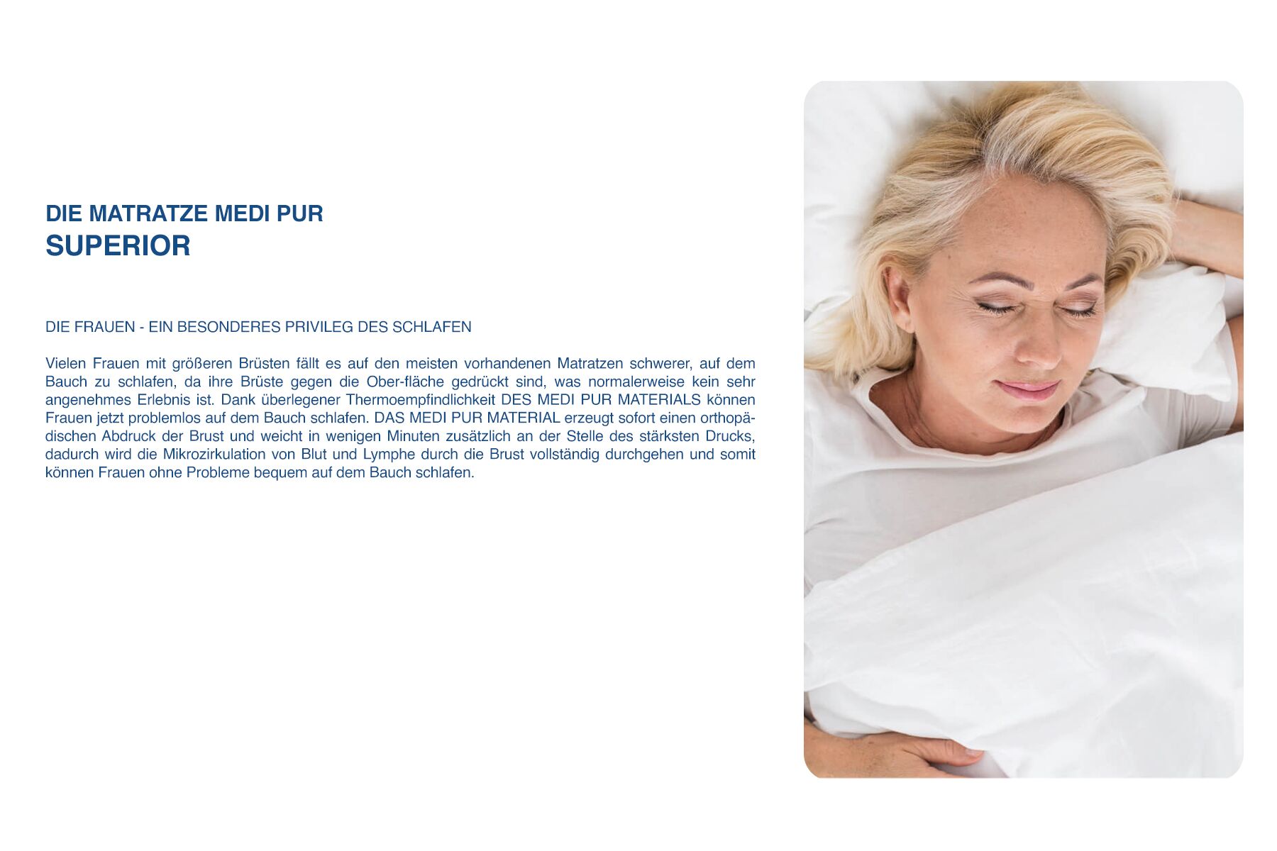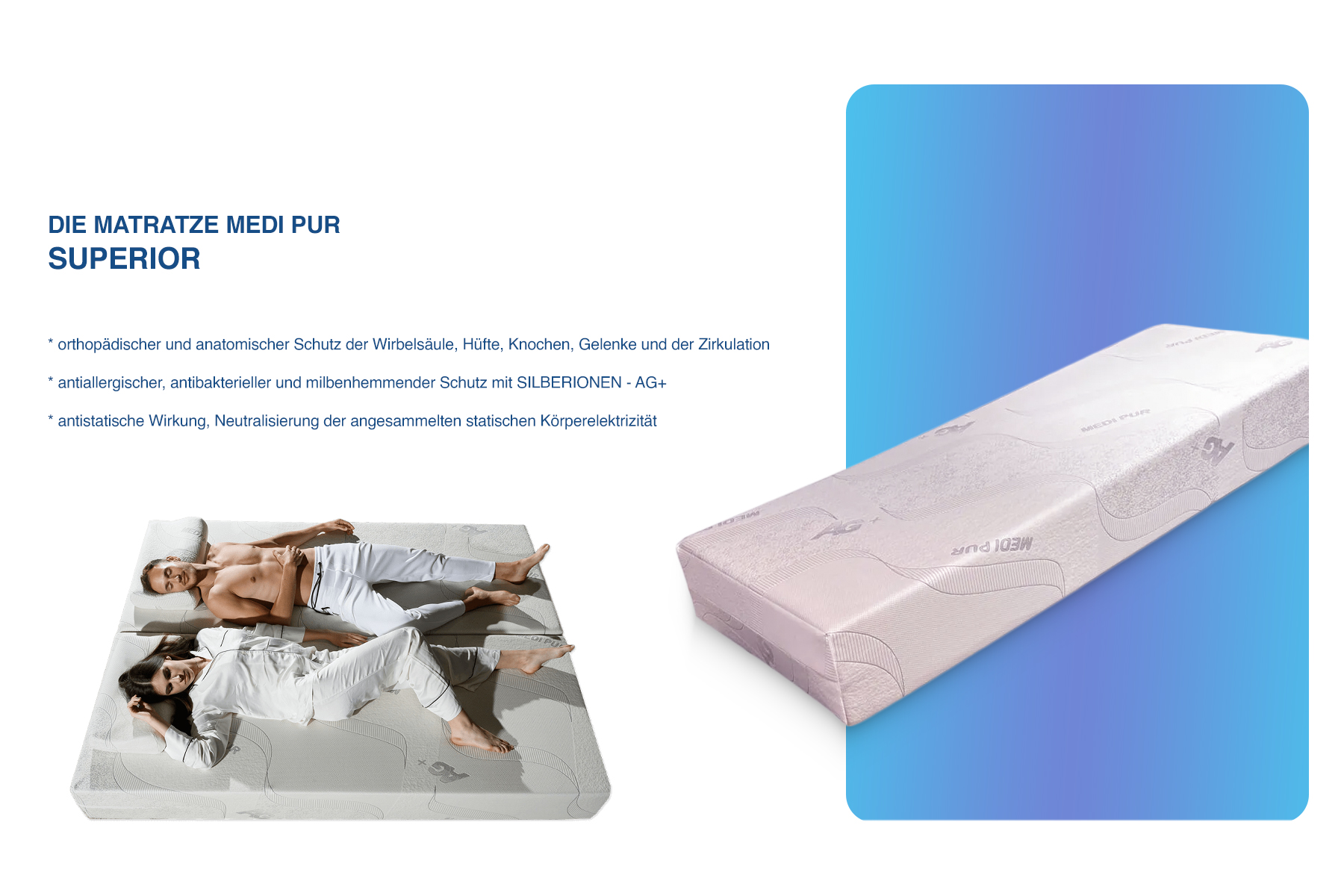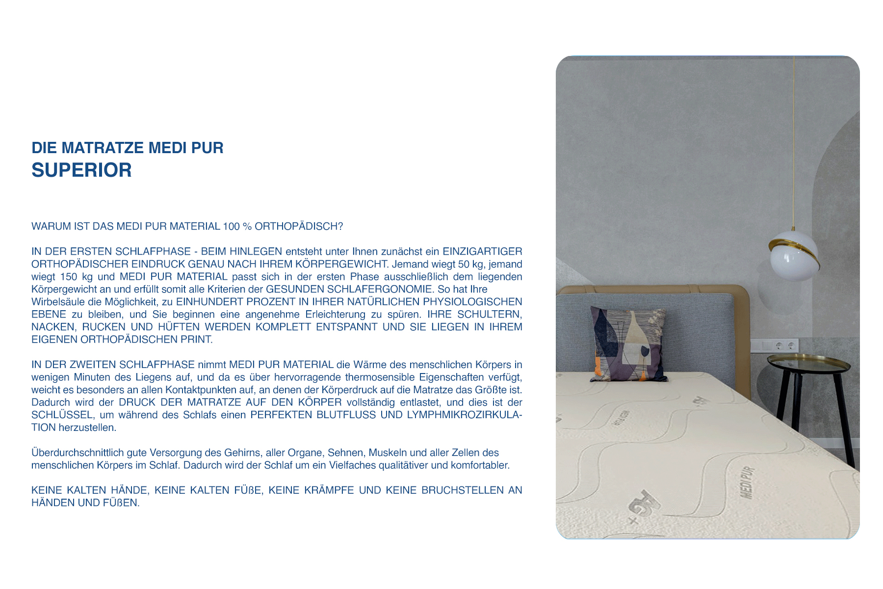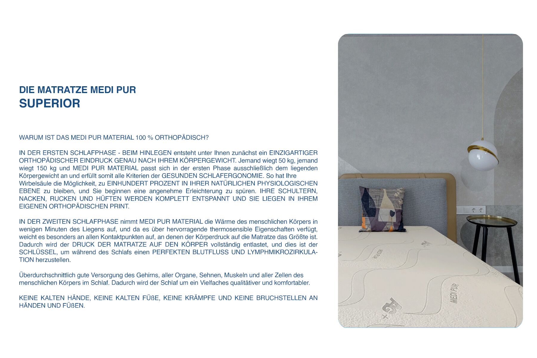 Die bisher beschriebenen Eigenschaften stellen AUSSCHLIESSLICH REINE ORTHOPÄDISCHE UND MEDIZINISCHE EIGENSCHAFTEN DER MEDI PUR MATRATZE dar.
