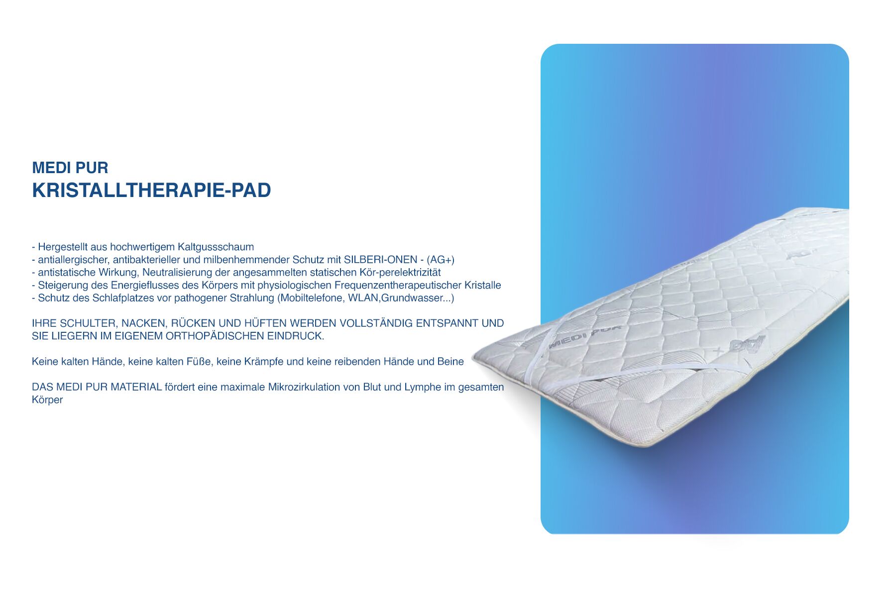 - MEDI PUR – KRISTALLTHERAPIE – besteht aus 2,5 cm dickem, THERMOEMPFINDLICHEM MEDI PUR ORTHOPÄDISCHEM MATERIAL, in dem eine THERAPEUTISCHE KRISTALL-MINERALMISCHUNG implementiert ist