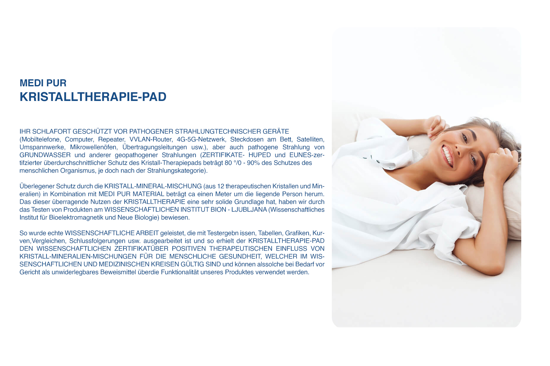 KRISTALLTHERAPIE-PAD erhöht den Schlafkomfort auf Ihrer bestehenden Matratze erheblich und ermöglicht einen langfristigen präventiven Schutz Ihrer PSYCHO-KÖRPERLICHEN GESUNDHEIT. Dank einer Vielzahl von Eigenschaften, die die Matratzen, auf denen wir schlafen, nicht besitzen, stellt sie buchstäblich eine EINZIGARTIGE MEDIZINISCHE THERAPIE dar, die fest auf Ihrer vorhandenen Matratze installiert ist und die Sie jede Nacht nutzen, wenn Sie sich bequem in Ihr Bett legen. Wir sind besonders stolz darauf, dass das MEDI PUR PROGRAMM von HALMED (Kroatische Agentur für Arzneimittel und Medizinprodukte) als MEDIZINISCHES PRODUKT – KLASSE I eingestuft wurde, womit sich nur wenige Matratzen auf dem Markt rühmen können. Somit gehören MEDI PUR PRODUKTE zur Gruppe der MEDIZINPRODUKTE, die uneingeschränkt verwendet werden können. Es ist jedem sehr zu empfehlen – Kleinkinder, Erwachsene, Kranke und vor allem Gesunde, um langfristig gesund zu bleiben. Als BEWEIS FÜR HERVORRAGENDE QUALITÄT und BESTÄTIGUNG DER WIRKSAMKEIT hat es neben HALMED und dem BION INSTITUT (Wissenschaftliches Institut für Bioelektromagnetik und neue Biologie) 10 RENOMMIERTE ZERTIFIKATE, AUSZEICHNUNGEN VON INNOVATIONS- UND LÖSUNGSMESSEN von mehreren renommierten Institutionen und Agenturen innerhalb der EUROPÄISCHEN UNION.